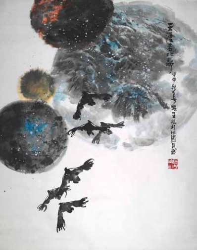 他在晚年创作的《天涯若比邻》,大鹏振翅翱翔于无垠天际,翼下是宇宙中交相辉映的大小星球。当大鹏冲破地域疆界的藩篱,当星球在浩瀚星空中遥相呼应,战争留下的创伤已升华为对“人类命运共同体”的深切期冀。这位从战火硝烟中走出的美术教育工作者,以毕生的艺术长征向世人证明,笔尖迸发的星火足以照亮民族脊梁,而当无数星火汇聚成火炬,便能穿透历史的厚重迷雾,在人类命运的长卷上镌刻“和平与共”的永恒题跋。唯有铭记战争的伤痛,方能读懂和平的千钧重量;唯有超越民族的视野局限,才能拥抱人类共同的璀璨明天。