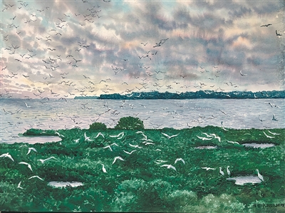 水彩画《湛江红树林湿地风光》,作者陈树中。“十四五”时期,广东湛江聚力打造“红树林之城”。如今,湛江红树林湿地不仅是净化海洋的“海上森林”,更是鸟的天堂、生物多样性宝库,被誉为“世界湿地生态恢复成功范例”。作品以此为着眼点,通过水天一色的空间布局和细腻的光影刻画,描绘了一幅壮阔优美的生态画卷。郁郁葱葱的红树林与波光粼粼的海面相辉映,在霞光中翩跹起舞的成群鹭鸟,不仅展现了生命的律动,更是对人与自然和谐共生理念的生动诠释。