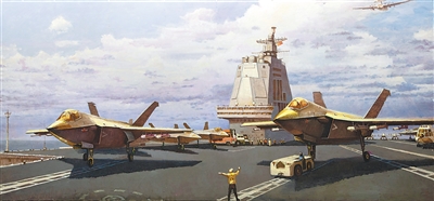 油画《箭上弦》,作者周补田。福建舰作为我国首艘采用电磁弹射技术的航母,标志着海军装备科技迈入全新阶段。歼—35作为新一代舰载战斗机,从列装到亮相九三阅兵,成为我国国防实力的生动注脚。通过画笔,“科技强军”的抽象概念转化为具象画面,并且不再是传统军事题材中单一的武器展示,而是聚焦歼—35在福建舰上“准备弹射”这一动态瞬间——如箭在弦,使命必达。