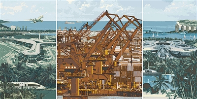版画《海南自贸港》,作者孔国桥、鲁利锋、王克景。南海之滨,改革潮涌。5年来,海南自贸港加速建设发展,步入成形起势新阶段。作品以绝版套色木刻和三联画形式,刻画了自贸港宏阔的场景,通过冷暖色彩的运用着意突出机场、港口、基建等主体,在跨时空描绘中多角度展现海南自贸港繁荣的景象和蓬勃的活力,奏响开放发展的时代乐章。