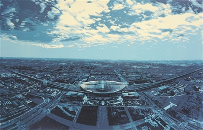 版画《雄安的黎明》,作者王芳。从“一块地”到“一张图”再到“一座城”,八载光阴,河北雄安新区拔节生长、日新月异。作品以俯瞰式构图,展开一幅壮阔图景。画面上,写实的雄安站巍然屹立,位于视觉中心;四通八达的路网和各功能区交织,配以沉稳的色彩和光线的巧妙运用,彰显这座城市璀璨的未来。