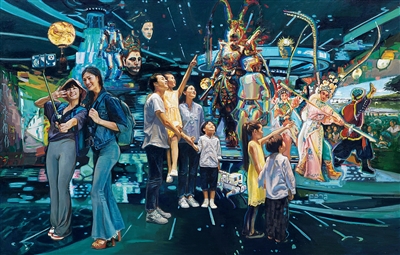 油画《文化的力量——深入推进“文化+科技”“文化+旅游”“文化+民生”》,浙江省油画院集体创作。近年来,文化创新创造活力涌动,“文化+”跑出美好生活加速度。作品生动捕捉这一时代脉动,以科技馆为背景,通过描绘不同年龄、不同身份、不同群体的观众,借助科技等力量乐享多元文化的场景,展现了文化与科技、旅游、民生融合发展趋势,以及其赋能人民美好生活的广阔空间。