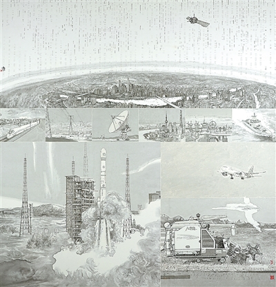 中国画《国之重器·北斗》,作者宋德志。作者通过精心重组主题元素,使海陆空景象巧妙交织,呈现了北斗在能源交通、农业生产、城市建设等领域的广泛运用,生动诠释北斗应用不断深度融入国民经济发展全局。素雅的笔墨处理赋予画面轻灵之美,意在表达北斗卫星导航系统那种看不见的支撑力量。