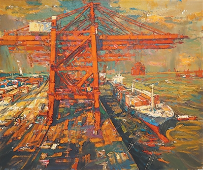 油画《扬帆起航——海丝起点之厦门港码头》,作者刘玉龙。东海之滨,海丝古港——厦门港正全力转型升级,不断续写传奇。作品撷取港口码头一景,以厚重的笔触刻画了林立的起重机和穿梭的船只等,折射出21世纪海上丝绸之路重要节点的繁忙景象与磅礴气象。