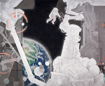 中国画《出舱》,作者杨斌。“十四五”以来,我国载人航天技术向着更高层次不断跨越。作品描绘了翟志刚、王亚平、叶光富3名航天员,在神舟十三号载人飞船与空间站组合体完成自主快速交会对接后,乘组执行第一次出舱活动的场景。作者以墨色的浓淡渲染以及物象的几何形态构成,营造出科技美感和浓浓诗意;黑白的强烈对比进一步凸显宇宙的浩渺深邃,为读者留下无限想象空间。
