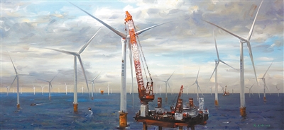 油画《惠来——海上风电》,作者冯少协。“海上风电走廊”点亮万亿绿能、海洋牧场智慧养殖平台矗立海面……“海上新广东”美丽画卷正徐徐铺展。作者将真实见闻诉诸笔端,以饱满的激情和开阔的构图,描绘了碧海蓝天间风电机组的宏伟矩阵。作品中,天空与海面构成宁静却充满张力的场域,工业力量与诗意图景相融,绘就清洁能源发展新篇章。