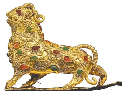 东汉中山穆王刘畅墓出土掐丝镶嵌金辟邪。