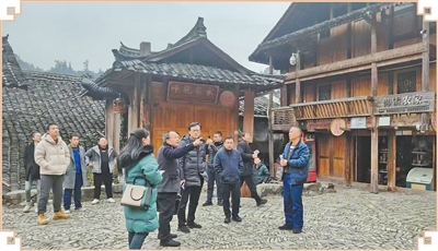 团队成员在贵州村寨调研古建筑。