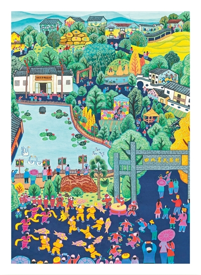 2025年,村里接待研学团队超2万人次。寻画而来的除了学生,还有不少游客。农民画的生活气息,让许多游客倍感亲切。农民画带火了文创产品、民宿和农家乐,让村民在家门口实现增收。村民郭红梅开起农家乐、承接研学接待,日子像画一样红火,“农民画把日子也照亮了。”