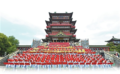 4月20日,江西南昌市东湖区滕王阁景区,学生在诵读《滕王阁序》。